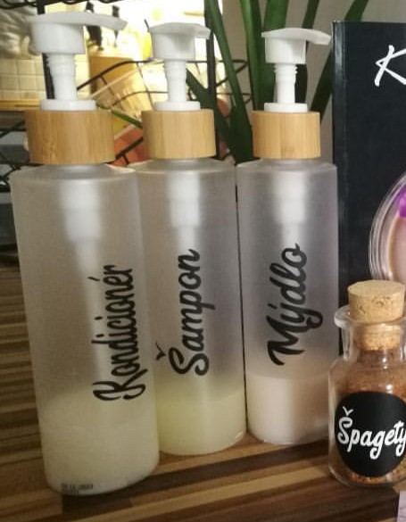 Barva: U průhledných dóz myslete na kontrast – vyhněte se například bílé samolepce na průhledné lahvičce s bílým mýdlem a podobně.